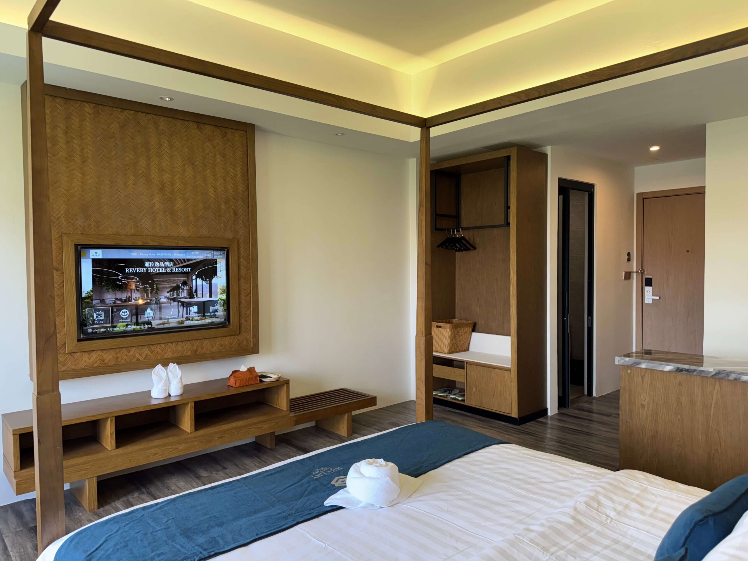 標準大床客房 色調柔和舒適的簡約風 戶外美景一覽無遺 讓您遠離塵世的喧囂